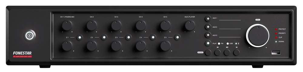 5-zónový zosilňovač triedy D pre 100V rozvody. Obsahuje 5x univerzálne symetrické vstupy (euroblock a combo konektor XLR/jack6,3mm) s prepínačom MIC/Line/fantóm +48V/Chime/VOX (vstup CH1 má paging), 3x stereo nesymetrický AUX vstup (2x RCA), 1x EMC vstup pre 100V (euroblock), remote MUTE a AMP IN (RCA). Fantómové napájanie na vstupoch 1-5 má 48V DC. Výstupy: 1x REC (2x RCA), 1x PRE OUT (RCA), 100V, 70V, 4ohm, 5x 100V. Obsahuje samostatnú reguláciu citlivosti a hlasitosti vstupov a výstupných zón a 2-pásmové korekcie. Zosilňovač má vstavaný USB/MP3 prehrávač s Bluetooth a FM tunerom. Prehrávanie MP3 sa spustí automaticky po zapnutí zosilňovača. Zosilňovač má zabodovanú ochranu proti prebudeniu vstupného signálu a proti prehriatiu s teplotne riadeným ventilátorom. Zosilňovač je určený aj na montáž do 19" RACKu.
