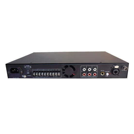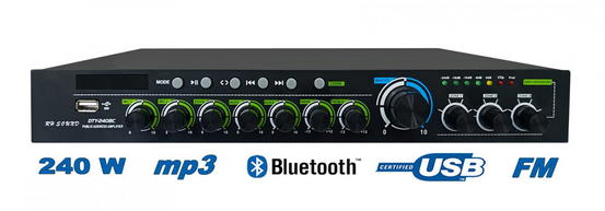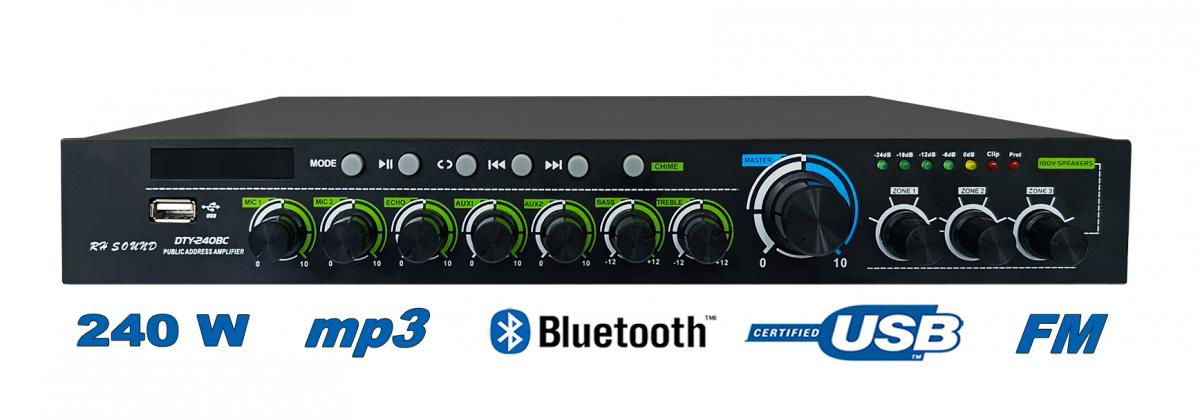 Moderní digitální (Class-D) rozhlasová ústředna malých rozměrů pro všestranné ozvučení se zabudovaným MP3 přehrávačem z USB a přehráváním MP3 přes BLUETOOTH. 3 regulovatelné zónové výstupy (100 V). 2x Symetrické MIC vstupy: 1x XLR/Jack 6,3mm kombinovaný konektor, 1x Jack 6,3mm s funkcí ECHO, MIC 1 vstup s možností PHANTOM napájení, Funkce ECHO na mikrofonních vstupech s možností nastavení úrovně. Tlačítko CHIME (gong). 2x AUX IN (stereo cinch), 1x AUX OUT (stereo cinch), Konektory pro připojení USB klíče. Ústředna je vhodná k ozvučení obecního rozhlasu, školního rozhlasu a vyzvánění, ozvučení kulturních sálů, restaurací a domů smutku. Specifikace: • Vstupy a výstupy: 2 mikrofonní a 2 AUX vstupy, 1x linkový výstup, • Tlačítko pro zapnutí fantomového napájení pro MIC 1, • Funkce ECHO na mikrofonních vstupech s možností nastavení úrovně, • Přehrávání MP3 z USB, Bluetooth a FM, • Celkové ovládání hlasitosti (MASTER), • 3 regulovatelné zónové výstupy (100 V), každá zóna s individuálním ovládáním hlasitosti, • Nezávislé ovládání hlasitosti mikrofonu a linky, • Ovládání výšek a basů na hlavním mixu, • 5-segmentový LED monitor výstupní úrovně, Clipu a Fault indikace, • Konektor pro FM anténu, • Ochrana: zpoždění zapnutí, ochrana proti přetížení, přehřátí a zkratu. Technické parametry: • Výstupní výkon: 240 W, 70 V - 100 V / 4-16 Ohm, výkon lze rozdělit do 3 zónových výstupů, • Napájení: AC 230 V, • Rozměry: 335 x 50 x 240 mm, • Hmotnost: 3,8 kg. Uváděcí cena !!! Parametre produktu Výrobce RH SOUNDTyp zesilovače rozhlasová ústřednaPočet kanálů 3Výkon 240 W (100 V, 70 V, 4-8-16 Ohm)Vystupy 2x mikrofonní XLR, Jack 6,3 mm, a 2 AUX vstupy, 1x linkový výstupVýstupy 3x 100 V, 70 V, 4-16 Ohm, 1x AUX OUT 2x cinchPřehrávání MP3 z USB, Bluetooth, FM tunerNapájení 230 V AC