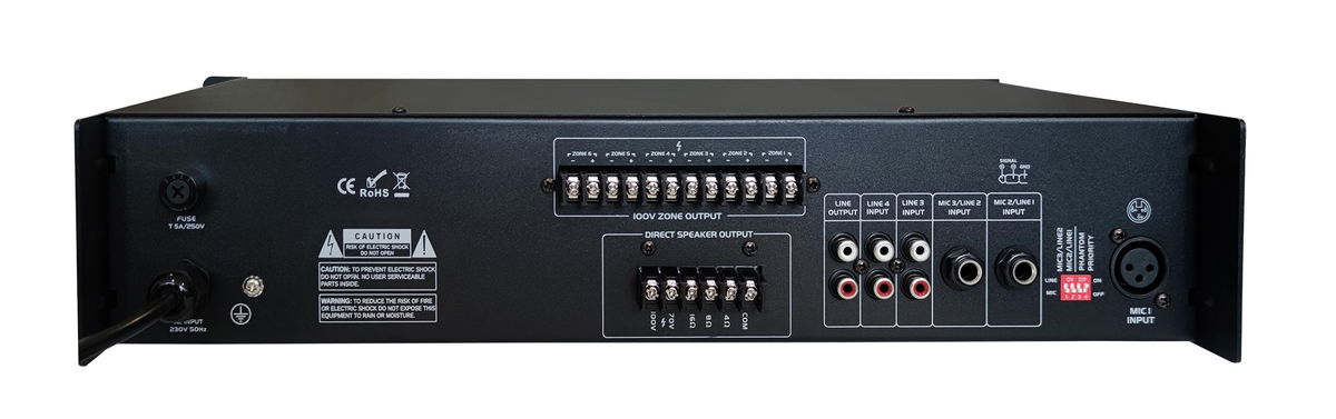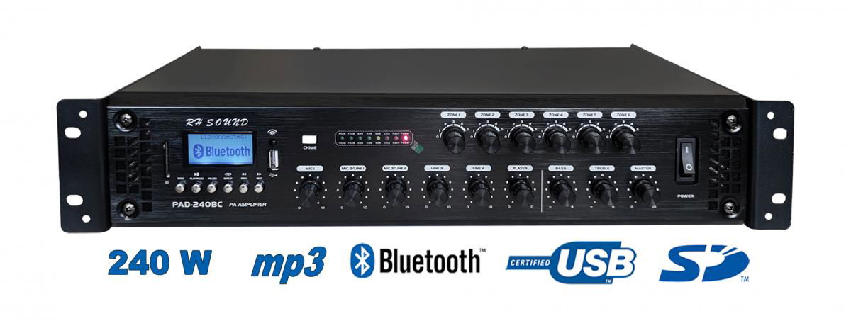 UVÁDĚCÍ CENA ! Moderní digitální (Class-D) rozhlasová ústředna pro všestranné ozvučení se zabudovaným MP3 přehrávačem z USB a SD, přehráváním MP3 přes BLUETOOTH a dálkovým ovladačem. 6 regulovatelných zónových výstupů (100 V). Vstupy: 3x MIC (Jack 6,3mm, MIC 1 s funkcí paging a možností PHANTOM napájení), 4x AUX IN (2x cinch), konektory pro připojení USB klíče a SD paměťové karty s možností nahrávání na USB. Ústředna je vhodná k ozvučení obecního rozhlasu, školního rozhlasu a vyzvánění, ozvučení kulturních sálů, restaurací a domů smutku. Technické parametry: • Výstupy: 4x 100V, 70V, 8-16 Ohmů, 1x AUX OUT (2x cinch). • Hlavní hlasitost MASTER VOLUME, ovládání hlasitosti každého vstupu samostatně, 2-pásmové korekce (LOW, HIGH), ovládání hlasitosti každé zóny samostatně, LED indikace výstupní úrovně. • Indikátor CLIP, • Indikátor FAULT (Chyba) • Výkon: 240 W (100 V, 70 V, 4-16 Ohm), výkon lze rozdělit do 6 zónových výstupů (100 V). • Napájení: 230 V AC, • Rozměry: 480 x 90 x 260 mm, • Hmotnost: 4,5 kg.