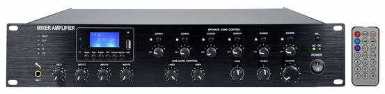 6-zónový mixážní zesilovač s MP3 přehrávačem, Bluetooth a FM tunerem pro 70/100V s flexibilitou nízkoimpedančního zapojení v rozmezí 4-16Ω, ideální pro instalaci do standardního 19" RACKu. Nabízí širokou škálu vstupů, včetně 1x MIC (jack 6,3mm), 3x MIC/LINE (XLR), 2x LINE (stereo RCA), 1x EMC (stereo RCA), a také specifické vstupy pro FM anténu.