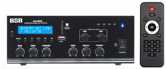 2-zónová rozhlasová ústředna pro 100V s možností nízkoimpedančního zapojení 4-16Ω. Obsahuje vstupy: 1x MIC (jack6,3mm), 2x AUX (2x RCA), 1x pro FM anténu. Výstupy: 1x LINE (2x RCA), 4-16ohm, 2x 100V. Má vestavěný MP3 přehrávač s displejem, USB konektorem, slotem pro SD kartu, Bluetooth připojením, FM tunerem a dálkovým ovladačem.