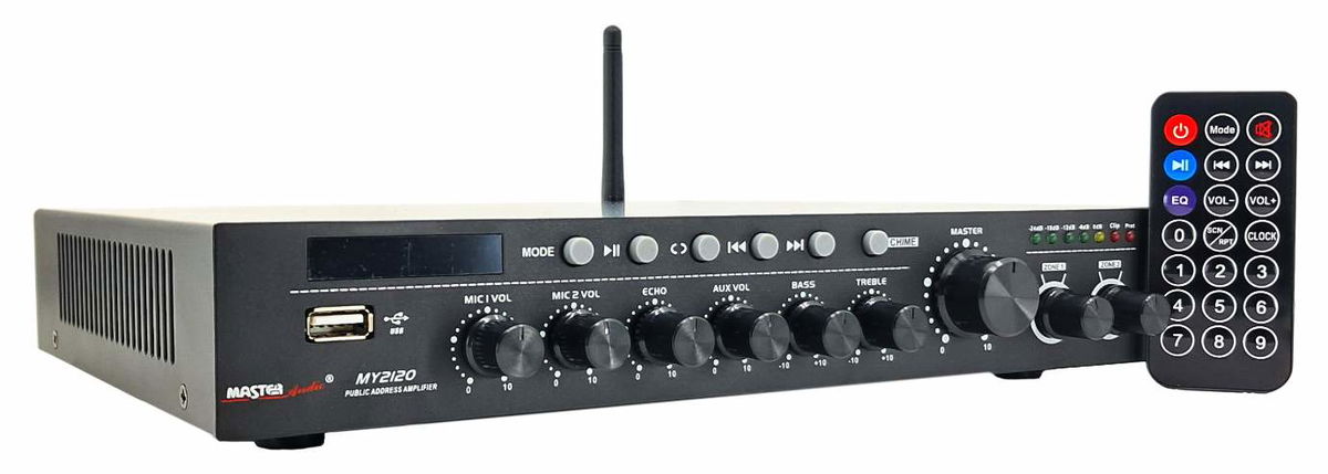2-zónová moderní digitální rozhlasová ústředna s výkonem 120W pro 70/100V s možností nízkoimpedančního zapojení 4-16 ohm. Obsahuje vstupy 2x MIC (jack6,3 a XLR/jack6,3), 1x AUX (2x RCA) se samostatnou regulací hlasitosti. Výstupy 1x AUX (2x RCA), 100V, 70V, 4-16 ohmů, 2x 100V. Má vestavěný MP3 přehrávač s LED displejem, USB konektorem, Bluetooth připojením a dálkovým ovládáním. Obsahuje 2-pásmové korekce a gong.