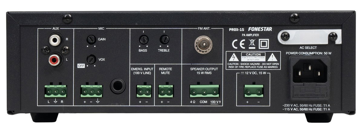 Fonestar PROX-15 - 100 V ústředna pro veřejné ozvučení s přehrávačem USB, MP3, FM, 15 W