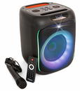 Malý přenosný karaoke systém. Má zabudovanou Li-ion baterii 3.7V/3600mAh a je osazen 6,5" reproduktorem. Má vestavěný USB/microSD/MP3 přehrávač/rekordér s Bluetooth připojením. Funkce TWS umožňuje bezdrátově připojit dva systémy k jednomu Bluetooth zdroji hudby a utvoříte si tak stereo systém Balení obsahuje ruční mikrofon a dálkový ovladač Sytém obsahuje barevný LED světelný efekt, který lze samostatně zapnout a vypnout Systém je vhodný pro školky, školy a různá dětská vystoupení, malé domácí karaoke párty apod. Má funkci karaoke a je vhodný pro malé zpěváky. K systému je možné připojit i externí zdroj hudby pomocí AUX vstupu. Systém se nabíjí pomocí USB-C kabelu z jakékoli USB nabíječky.