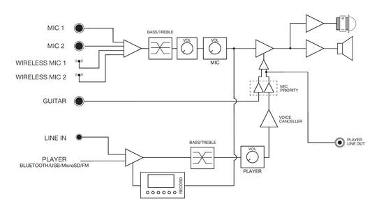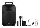 Součástí dodávky jsou dva bezdrátové mikrofony – ruční a náhlavní s bodypack vysílačem – které umožňují maximální volnost pohybu při prezentacích nebo karaoke vystoupeních. Kromě nich můžete připojit i další mikrofony přes dva 6,3mm MIC vstupy s individuálním ovládáním hlasitosti, echo efektem a tónovými korekcemi.