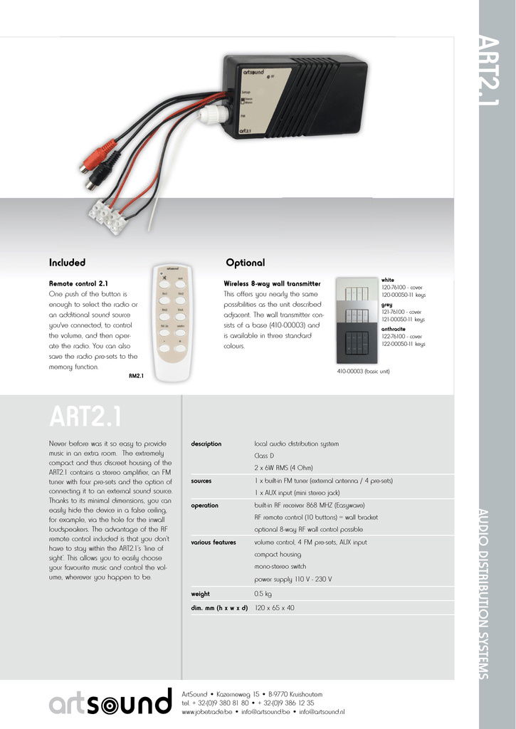 Nikdy nebylo tak jednoduché ozvučit místnost. ART 2.1 může být umístěn kdekoliv, nehřeje, nepotřebuje větrání, jen napájení a reproduktor. Ovládat ho můžete RF dálkovým ovladačem, jehož výhodou je, že nemusí zůstat na dohled od jednotky. Stačí jedním stiskem zvolít rádio nebo externí zdroj hudby, který máte připojený nebo ovládát hlasitost a rádio. Také můžete ukládat rozhlasové stanice do paměti předvoleb.