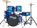 Sada bicích včetně stojanů, stoličky, činelů i paliček. Korpusy z 6ti vrstev lipové překližky. Velký buben 20" x 16", Tomy 10" x 8" a 12" x 9", stojan na přechody, Floor Tom 14" x 14", dřevěný snare 14" x 5,5". Stojan na snare, šlapka, 14" Crash se stojanem, 13" Hi-Hat se stojanem, stolička, paličky. Barva modrá fólie.