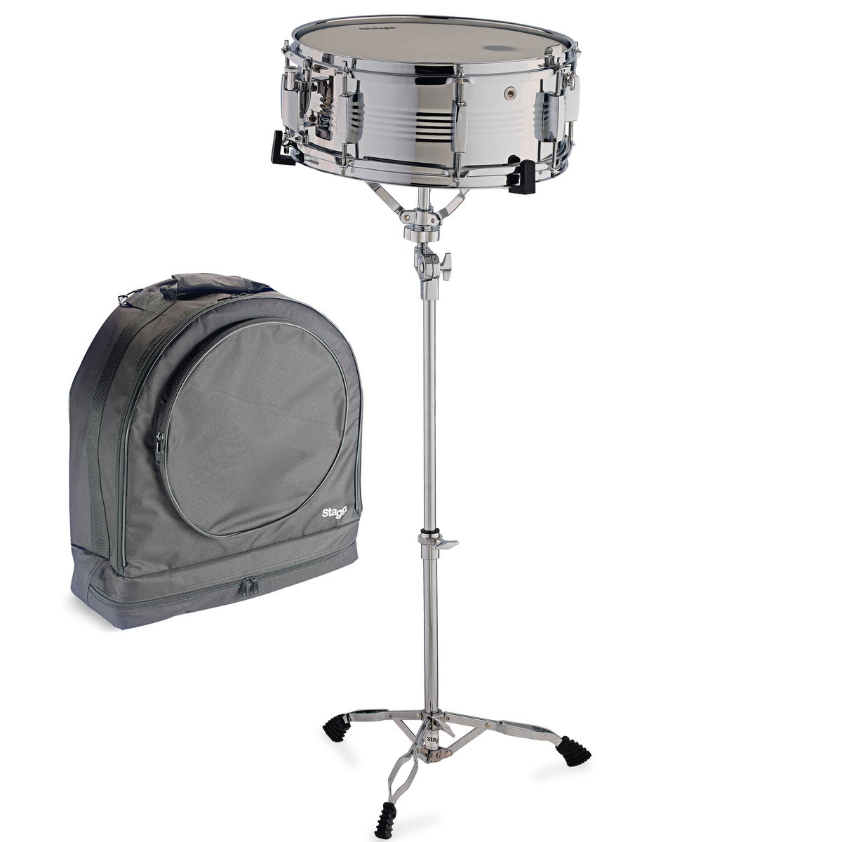 Sada: rytmický bubínek kovový 14" x 5,5" (8 šroubů) + stojan na bubínek koncertní (nastavení výšky od 67,5 do 91 cm) + nylonový batoh s popruhy na záda + pár paliček + ladicí klíč.