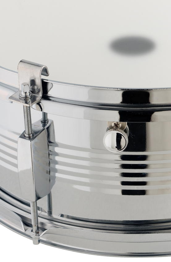Rytmický bubínek kovový 14" x 5,5" (8 šroubů), nastavitelné vnitřní tlumení vrchní blány, blána pískovaná.