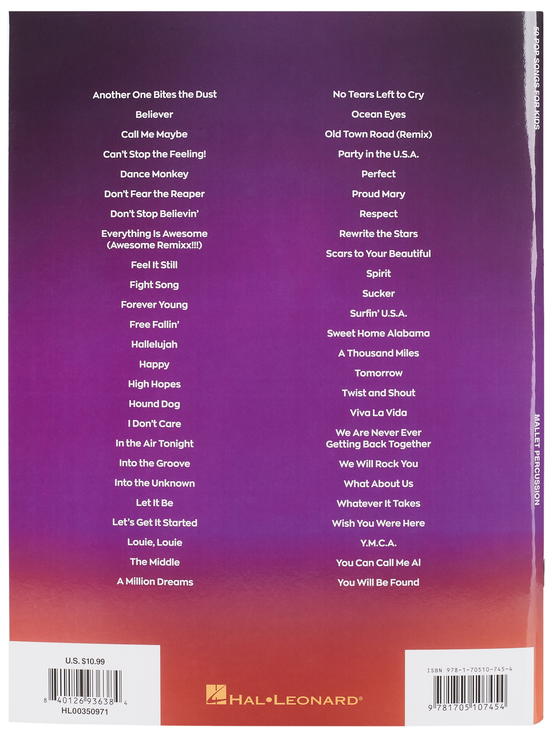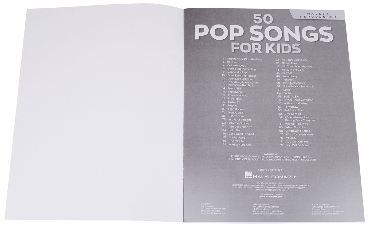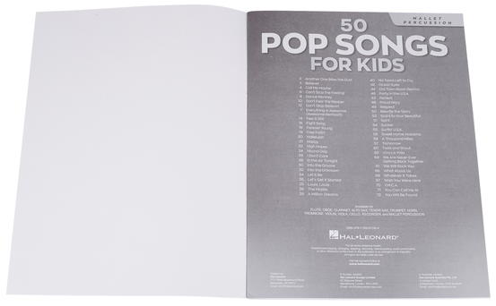 Když se děti učí na hudební nástroj, tak chtějí hrát především skladby, které znají a milují. Tímto heslem se řídí i publikace 50 Pop Songs for Kids obsahující sbírku padesáti současných hitů populární hudby v lehkých úpravách pro melodické bicí nástroje (xylofon, vibrafon, marimbu např.). Mezi skladbami nechybí Believer • Don't Stop Believin' • Happy • High Hopes • Let's Get It Started • Ocean Eyes • Perfect • Rewrite the Stars • A Thousand Miles • You Will Be Found • a další.
