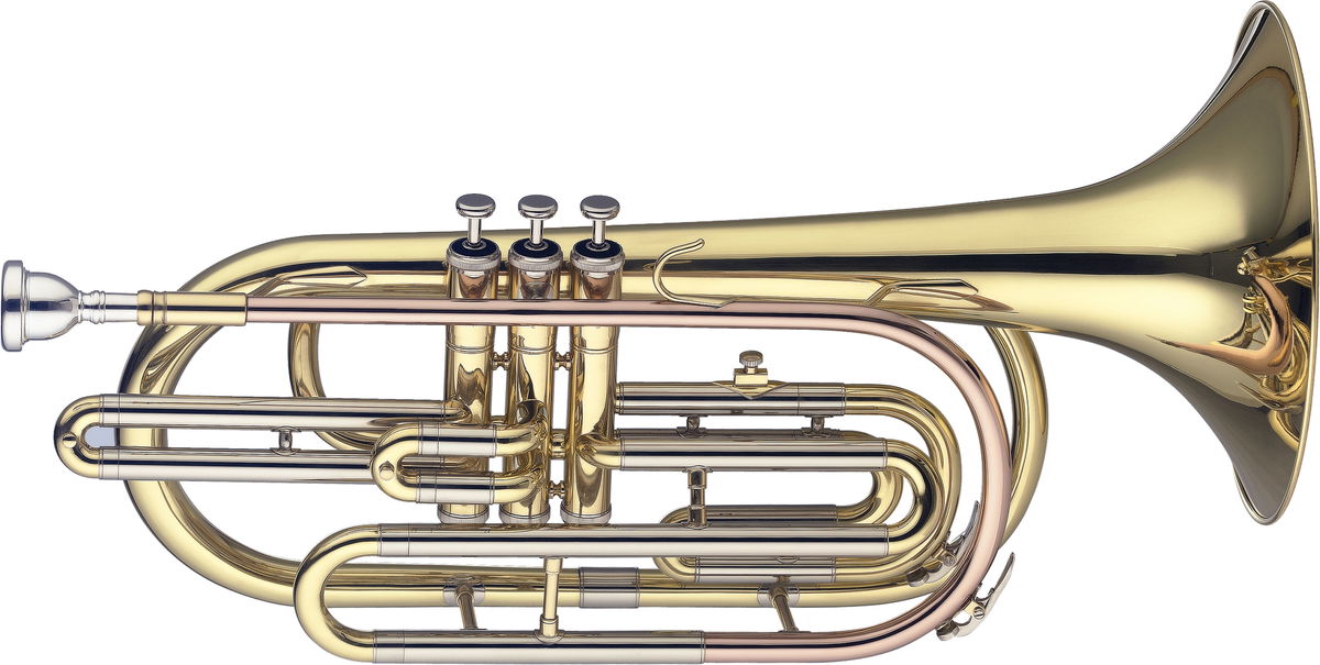 B trombon pochodový perinetový, 3 ventily, vrtání 12,2 mm, ozvučník 225 mm, zlatomosazná ústnice, pakfongové tahy, lak, nylonové vyztužené pouzdro.