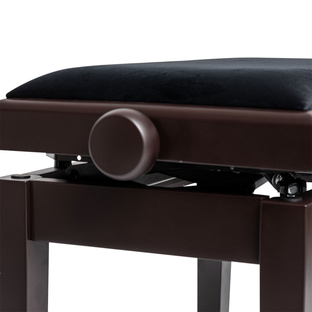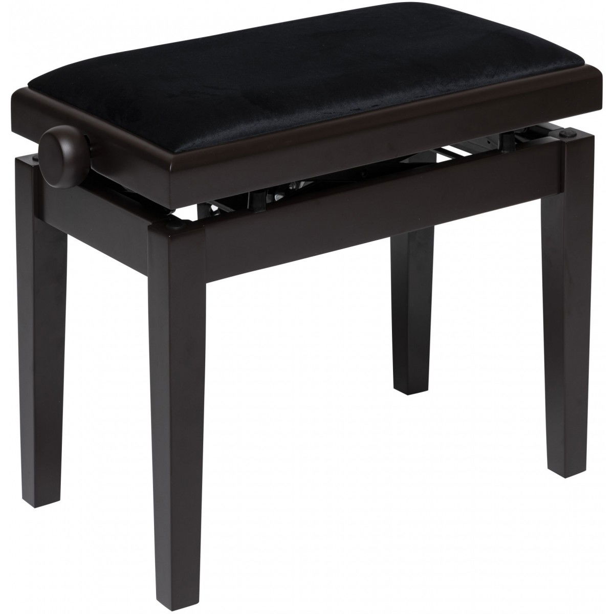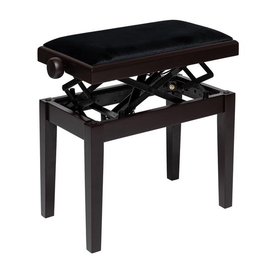 Hydraulická klavírní stolička, nastavitelná výška 50 - 60 cm, samostatné mikro-nastavení výšky na jedné noze, snadný zdvih jedním otočením (systém „Confort Hydraulique“), rozměr sedáku 53 x 31 cm, nosnost 200 kg, min. zatížezní 37,3 kg, hmotnost 12,9 kg. Barva palisandr matná, sedák černý samet.