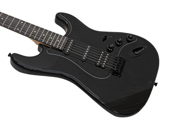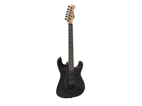Elektrická kytara typu Strat. Tělo jasan, šroubovaný krk javor, menzura 648 mm, hmatník palisandr, 22 pražců, černý pickguard, kobylka klasické tremolo typu Strat, chromovaná mechanika, 1x dvoucívkový snímač (Humbucker), 2x jednocívkový snímač (single coil), 1x ovládání hlasitosti, 2x ovládání tónu, 5-ti polohový přepínač. Barva černá, lesklá.