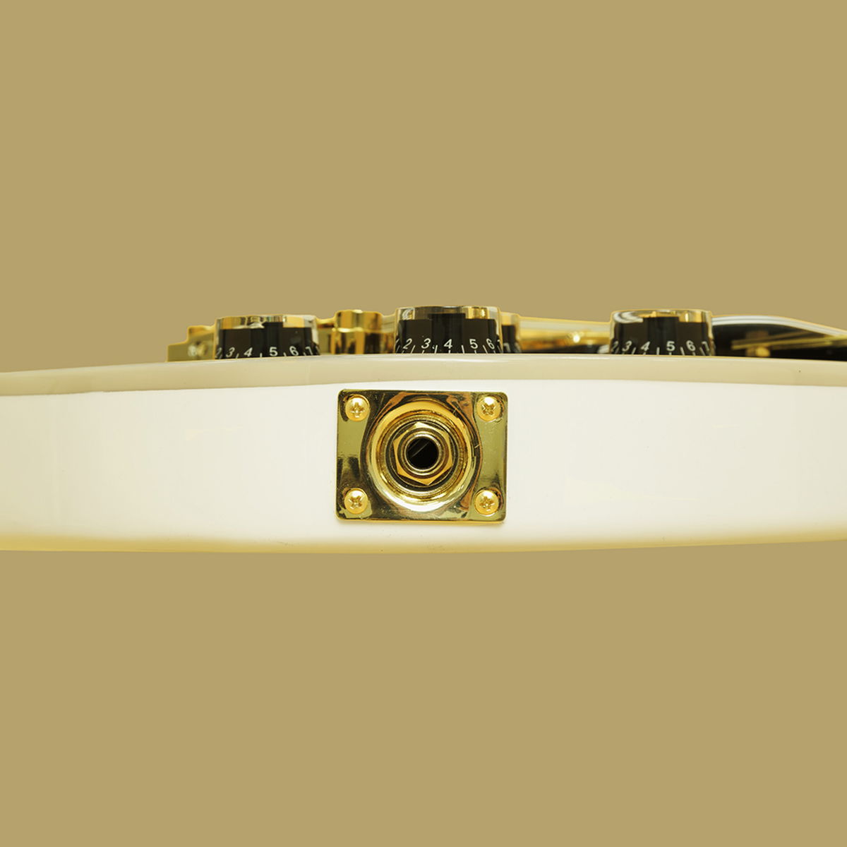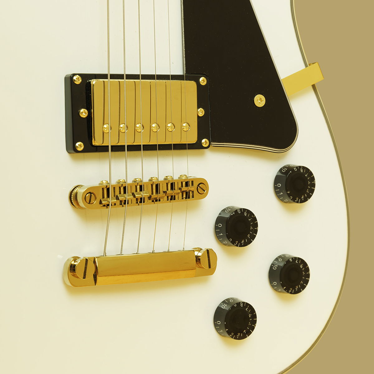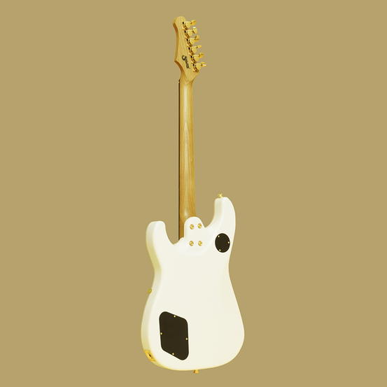 Elektrická kytara řady Legacy k 30. výročí, tělo masivní mahagon, krk pečený javor, šroubovaný s jednoduchým přístupem k posledním pražcům, saténová povrchová úprava, menzura 648 mm, palisandrový hmatník s výložkou v podobě bílých teček na základních polohách, 21 pražců z nerezové oceli, hlava barevně sladěná s logem Stagg Legacy, 2x snímač humbucker AlNiCo, zlatý kryt, 2x ovladač hlasitosti ("push-pull" - rozdělení humbuckeru), 2x ovladač tónu, 3-polohový přepínač snímačů, zlatá kobylka Tune o matic s dorazem, zlatá zamykatelná litá mechanika, kostěný nultý pražec, 5-ti vrstvý plovoucí pickguard, černobílé lemování z ABS, zlatý struník, struny vyrobené v Koreji, tloušťka 10/46. Barva bílá.