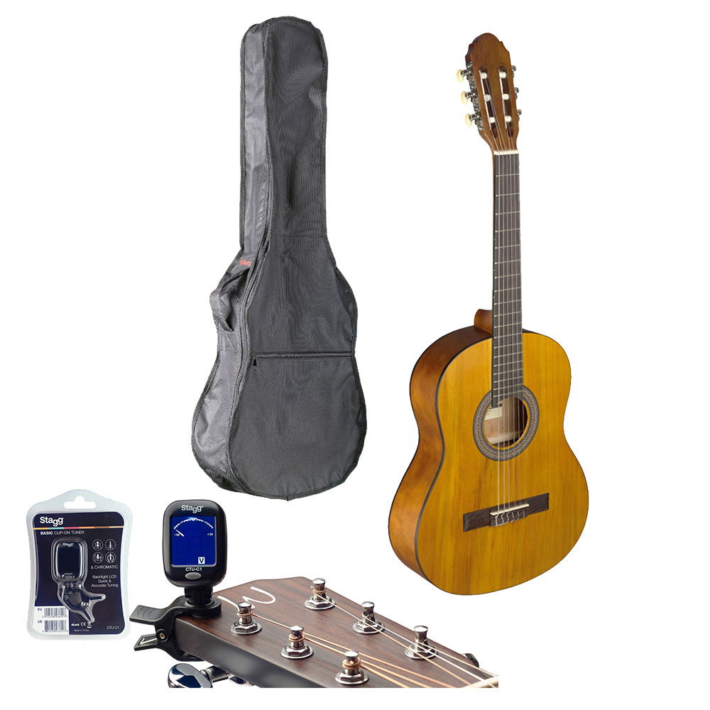 Klasická 3/4 kytara v sadě s přepravním pouzdrem a ladičkou. Vrchní deska nástroje, spodní deska a luby lípa, hmatník a kobylka kompozitní ořech. Barva přírodní, povrchová úprava matný lak. Pouzdro pro 3/4 klasickou kytaru má vnější kapsu, dva ramenní popruhy a ucho pro přenášení. Materiál nylon, barva černá. Klipová ladička nabízí několik módů ladění: chromatická, kytara, baskytara, housle, ukulele. Vysoká přesnost 0,5 centů, rozsah ladění A0 - C8. Rotační klip pro uchycení na jakoukoliv kytarovou hlavu nebo jiný plochý povrch. LCD displej, napájení pomocí přiložené 3V baterie.