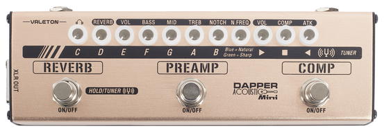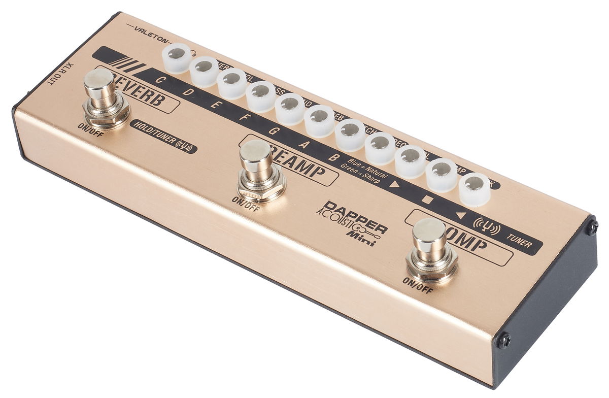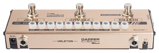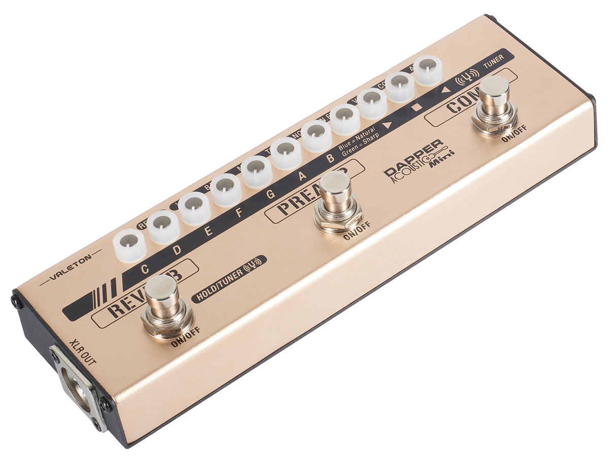 Dapper Acoustic Mini je malý podlahový multiefekt pro akustickou kytaru s intuitivním uživatelským rozhraním a třemi samostatnými efektovými sekcemi – kompresorem s možností nastavení intenzity a rychlosti nástupu komprese, předzesilovačem s třípásmovým ekvalizérem a ovladači pro boj s nežádoucím efektem zpětné vazby a one-knob sekcí efektu Reverb. Podlahový efekt dále nabízí integrovanou ladičku, symetrický XLR výstup pro vyvedení signálu do mixu či zvukovky nebo sluchátkový výstup s vlastním ovladačem hlasitosti výstupu a cab simulací. K napájení multiefektu slouží 9V adaptér. Asijská značka Valeton nabízí kytarové efekty, multiefekty a hudební příslušenství v příznivém poměru ceny a výkonu. Produkty značky se vyznačují jednoduchým designem, intuitivním uživatelským rozhraním a cílením na zvukovou kvalitu, tak aby si z firemního portfolia dokázali vybrat začínající i zkušení muzikanti.