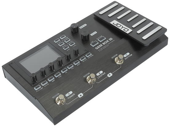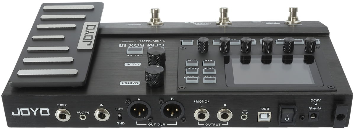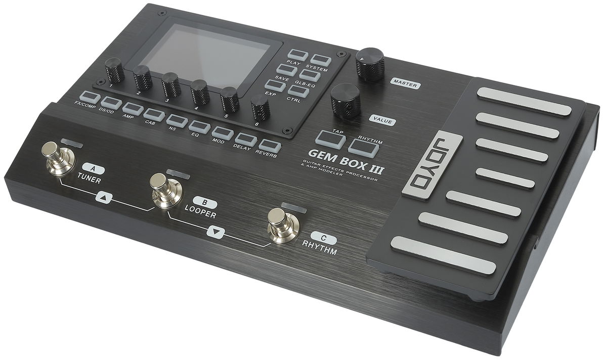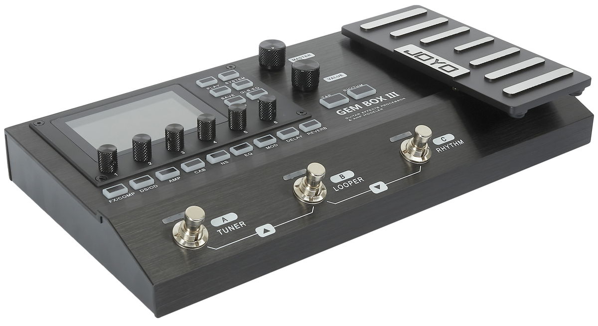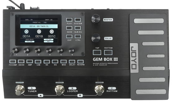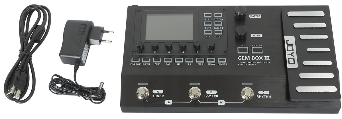 Gem Box III představuje dosud nejnadupanější kytarový multiefekt z produkce čínské značky Joyo. V devíti efektových podskupinách nabízí 157 digitálních efektů (typu FX/Comp, Distortion/Overdrive, Noise Supressor, EQ, Modulation, Delay, Reverb), 61 modulací kytarových předzesilovačů a 26 IR simulací reproboxů (lze nahrávat vlastní IR – 16/24/32bit, full sample rate, formát WAV) a celkově 300 firemních presetů. Intuitivní uživatelské rozhraní s přehledným displayem vám umožní jednoduše editovat, ukládat a vyvolávat jednotlivé presety a organizovat pořadí efektů v rámci signálové cesty. Expression pedálem lze ovládat hlasitost výstupního signálu i parametry jednotlivých kytarových efektů obsažených v těle multiefektu. Mnohé jistě potěší i funkce bicího automatu se čtyřiceti různými patterny/beaty bicích nástrojů a deseti patterny metronomu, vestavěný Looper s 52 sekundami nahrávacího času a nezbytná zabudovaná ladička. Pozadu multiefekt nezůstává ani v rámci propojení, kdy mono/stereo a dva symetrické XLR výstupy poskytují potřebnou flexibilitu v rámci signálového routingu, USB B rozhraní nahrávání přímo do DAW a nahrávání firmwarových updatů. Bezproblémové užívaní multiefektu v prostředí domova zaručují vstup pro audio/mp3 tracky, do kterých můžete libovolně jamovat, a výstup do sluchátek, takže se i v prostředí sídlištních jednotek nemusíte obávat, že byste rušili sousedy. Řadu ovládacích prvků lze díky vstupu EXP2 rozšířit o externí expression pedál. K napájení efektu slouží přiložený 9V adaptér.