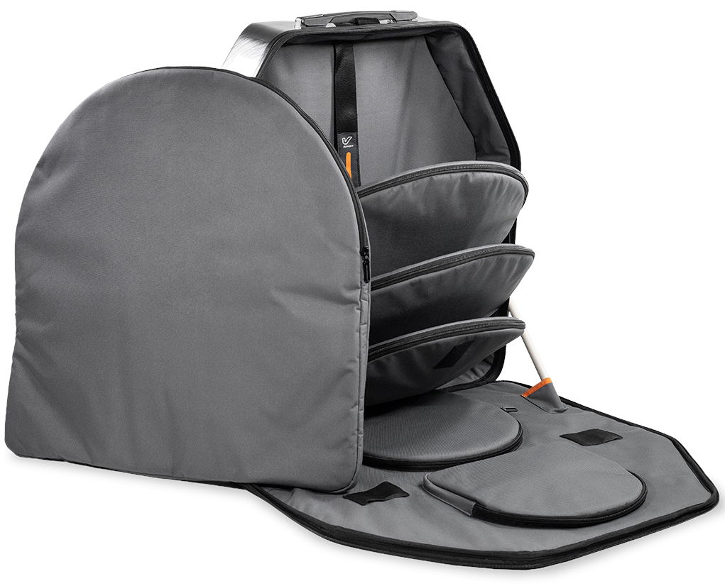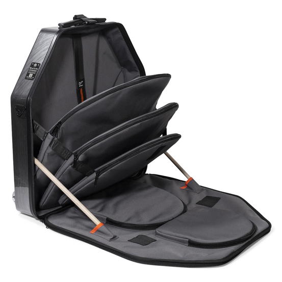 Zboží bylo vybaleno z obalu, jinak je zcela nové, nepoužité. Polepená, nevzhledná kartonová krabice. Tato nová souprava obalů od značky Gruvgear s revolučním designem určitě usnadní život nejednomu bubeníkovi. Hybridní obaly Veloc v sobě kombinují odolnost pevných obalů, přičemž si stále udržují nízkou hmotnost. Vyrobeny jsou z voděodolné textilie 1680D a z jednu stranu mají z pevného ABS/polykarbonátového plastu. Výhodou je, že se dají pomocí magnetického systému jednoduše přichytit na přepravní vozík, takže celou soupravu, včetně hardwaru, můžete bezpečně a pohodlně převézt najednou. Díky jejich speciálnímu patentovanému designu je také možné celou sadu složit/rozložit bez toho, abyste museli obaly z vozíku sundávat. Samozřejmostí jsou polstrované rukojetě, velice kvalitní zipy, nebo u většich obalů také odnímatelné polstrování. Veloc také přichází s bezpečnostním systémem – každý obal má v sobě speciální „Global Recovery Tag,“ tedy štítek s unikátním sériovým číslem, který se dá rozpoznat na více než 2800 celosvětových letištích. V případě ztráty je tak velice jednoduché se dostat zpátky ke svým věcem. Tento obal v sobě ukrývá 5 kapes na činely různých velikostí (až do 24") a disponuje odnímatelnými kolečky a výsuvnou rukojetí.