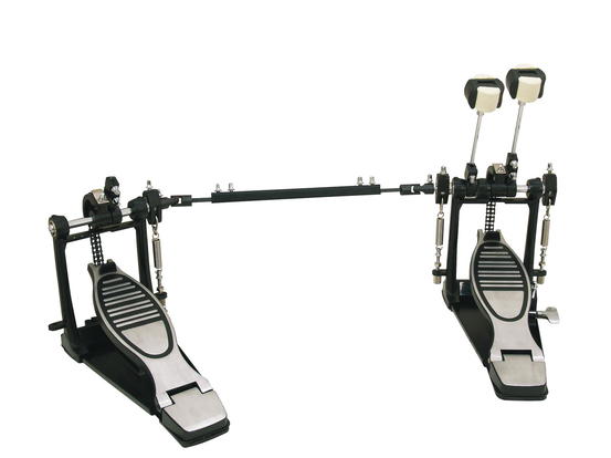 Profesionální dvoušlapka k bicím se dvěma dvojitými řetězy. Stabilní základová deska. Postranní zarážkový šroub pro pohodlné použití. Robustní kardanová osa.