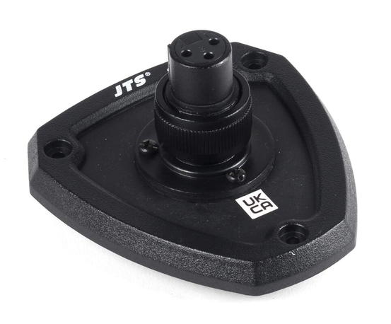Přírubový stolní odpružený mikrofonní podstavec pod mikrofon na husém krku s konektorem XLR. Konektor je uchycen na odolném gumovém plátu v plastovém rámu, který zabraňuje přenosu otřesů ze stolu do mikrofonu. XLR konektor má otočné uzamčení pro bezpečné uchycení mikrofonu.