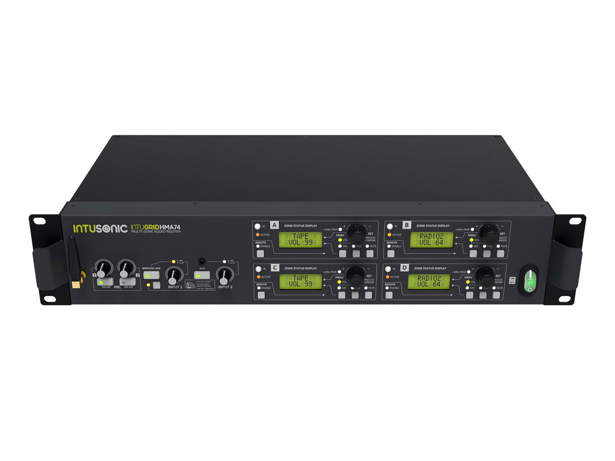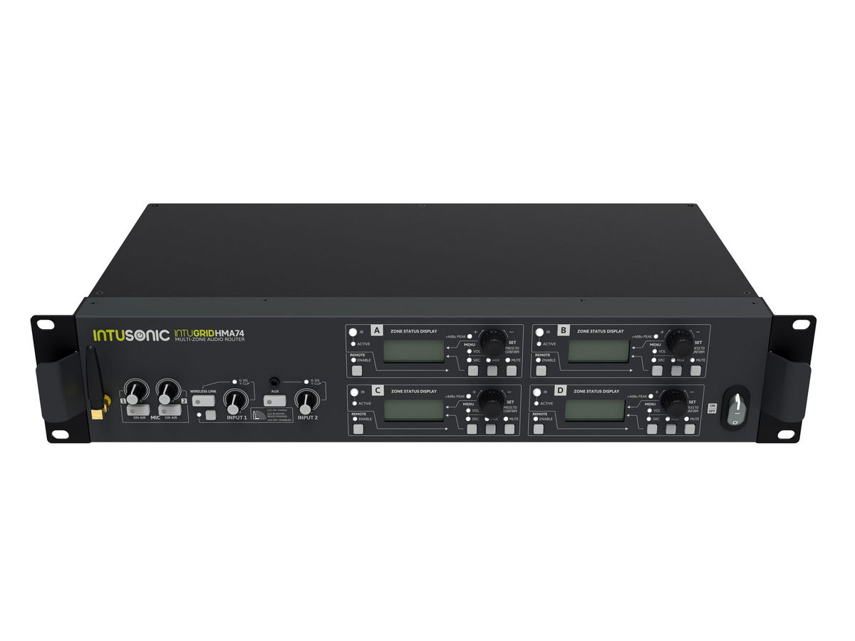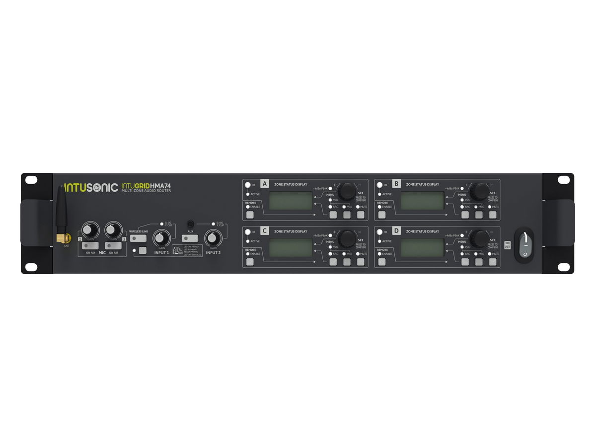 INTUGRID HMA74 je základní jednotka pro digitálně řízené zónování zvuku Intusonic, kterou doplňuje vzdálený nástěnný panel HZE11. Společně poskytují škálovatelný systém směrování zvuku pro hudbu na pozadí. HMA74 nabízí dva mikrofonní vstupy, 5 linkových vstupů, 3,5mm TRS vstup na předním panelu a bezdrátové audio spojení LINKOUSTIC 4.2, které lze flexibilně směrovat do jeho 4 výstupních zón, přičemž každou z těchto zón lze ovládat buď z palubní desky. uživatelské rozhraní, přiložený IR dálkový ovladač nebo nástěnný dálkový ovládací panel. Každá zóna může být široce konfigurována tak, aby splňovala požadavky aplikace, přičemž interakce uživatele je extrémně jednoduchá. Zónový vzdálený nástěnný panel HZE11 umožňuje dálkově ovládat všechna nastavení zón a navíc přijímá místní audio. 19" audio router, 5 stereo a 2 mikrofonní vstupy, IR dálkové ovládání a možnost ovládání RS485. Ovládání přes IR dálkové ovládání; RS 485; LINKOUSTIC 4.2 Wireless Audio Link. LCD displej. (19") 48,3 cm instalace do racku 2 U. Obsah balení: 1 x zařízení, 1 x napájecí kabel, 12 x šroubovací konektor, 1 x zástrčka (samec), 4 x noha, 1 x anténa, 1 x dálkové ovládání, 1 x baterie, 1 x návod k použití
