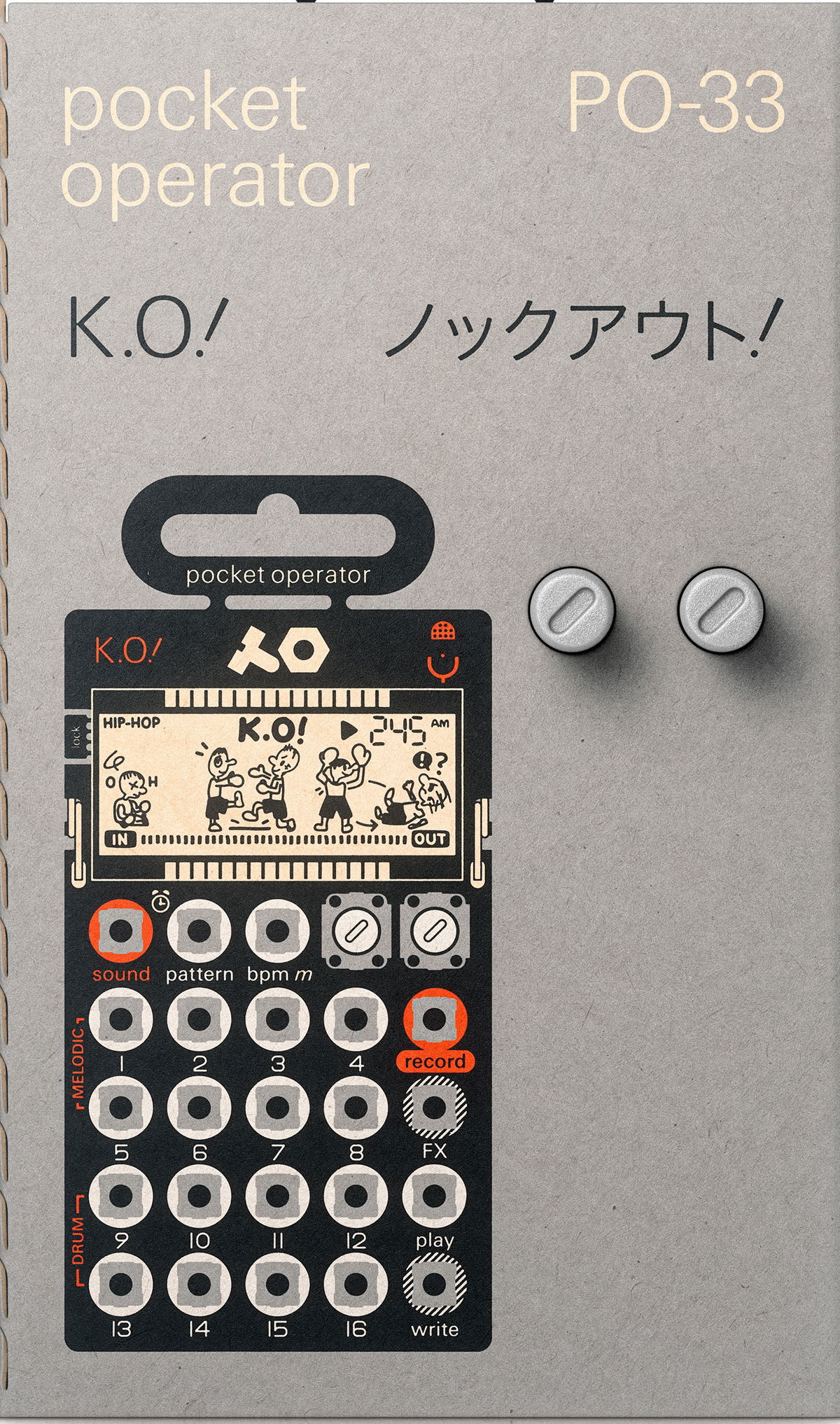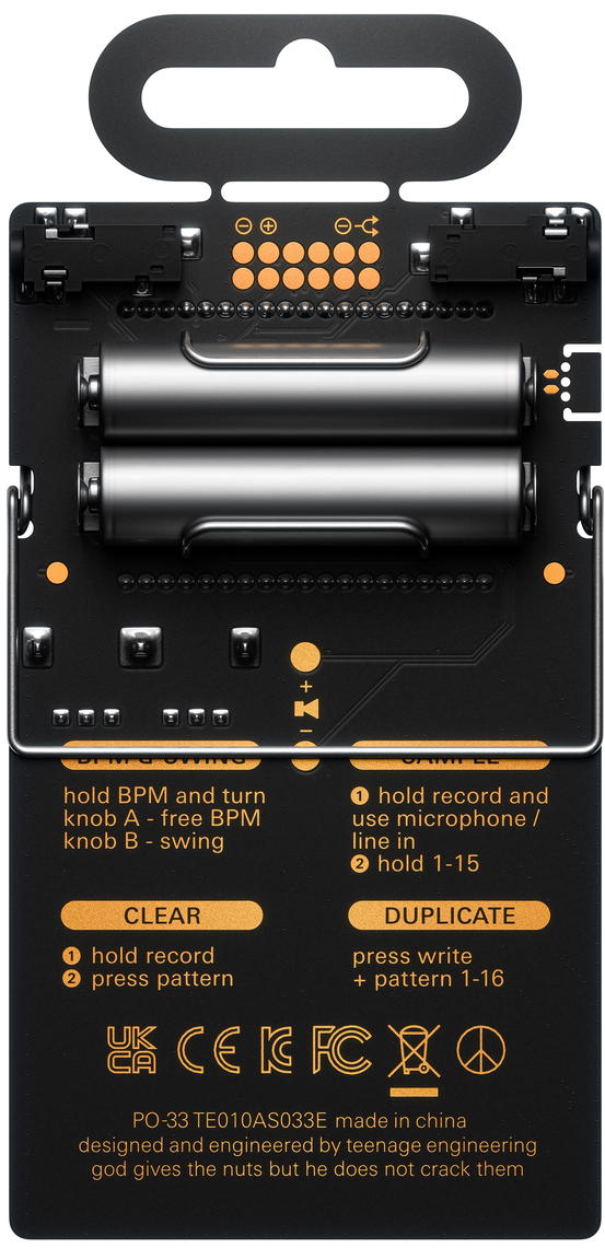 K tomuto produktu vám rádi nabídneme zakázkový case Razzor z naší vlastní výroby, navržený pro maximální ochranu při transportu. Kufry vyrábíme na míru a přesně podle vašich přání. Inspiraci a detaily najdete na razzorcases.cz. PO-33 K.O.! obohacuje „kalkulačkové“ syntezátory švédských Teenage Engineering o sampler. Váš miniaturní set-up tak nyní můžete obohatit i o vlastní zvuky. Samplovat lze pomocí zabudovaného mikrofonu nebo linkového vstupu a uložit můžete až 8 melodických samplů a 8 bicích samplů. Melodické samply přehrajete chromaticky, z bicích samplů si snadno postavíte svůj „signature“ drum kit. Maximální délka nahrávky je 40s. Výrobci pochopitelně nezapomněli ani na sekvencér nebo 16 efektů, pomocí nichž snadno vyšperkujete svou výslednou performanci. Nechybí zabudovaný reproduktor, stojánek ani hodiny s budíkem. Pocket Operatory lze synchronizovat pomocí audio clocku přes propojovací kabel. K napájení slouží dvě AAA baterie, s nimiž PO vydrží v provozu měsíc a až dva roky ve stand-by režimu.