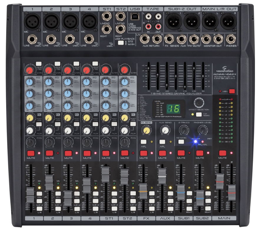 Řada vysoce kvalitních mixpultů ALCHEMIX od značky Soundsation vám nabídne skvělé uživatelské vlastnosti, intuitivní ovládání a brilantní efektový procesor. Mikrofonní vstupy disponují ultra tichým předzesilovačem a fantomovým napájením pro kondenzátorové mikrofony. Pulty jsou vhodné pro domácí nahrávací studia, zkušebny, vzdělávací zařízení nebo live performance. Alchemix 402UFX je kompaktní profesionální mixážní pult, který disponuje odolnou a lehkou konstrukcí pro snadný transport. Osmikanálový pult nabízí čtyři vstupy pro mikrofony a hudební nástroje s fantomovým napájením, dva stereo vstupy pro klávesy a dvojici vstupů pro hudební přehrávače, tablety a DJ kontroléry. Pult dále disponuje šestnácti efekty o kvalitě 24bit/48kHz s Tap tempo tlačítkem, sedmipásmovým grafickým ekvalizérem, třípásmovým EQ pro instrumentální kanály, sluchátkovým výstupem a dvěma stereo XLR výstupy pro připojení k dalšímu PA. Integrovaná zvuková karta vám umožní vytvořit si nahrávky o kvalitě 24bit/96kHz, které si pomocí USB portu uložíte přímo do vašeho PC nebo Mac.