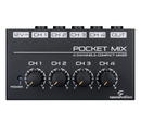 Kompaktní čtyřkanálový mixpult Pocket Mix od společnosti Soundsation využijete všude tam, kde potřebujete rychle a jednoduše sloučit několik zvukových stop dohromady. Každý kanál disponuje vlastním ovladačem hlasitosti. Zařízení je osazeno čtyřmi mono vstupy a jedním mono výstupem (Jack TS 6,3 mm).