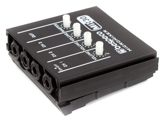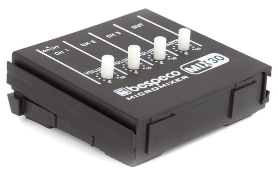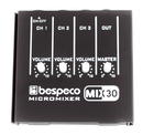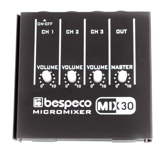 Bespeco MIX30 je jednoduchý malý tříkanálový mixážní pult, který umožňuje připojení 3 mono signálů, jejich následné smíchání pomocí potenciometrů volume a odeslání na mono výstup. Napájení pultu je řešeno 9 V baterií (není součástí balení).