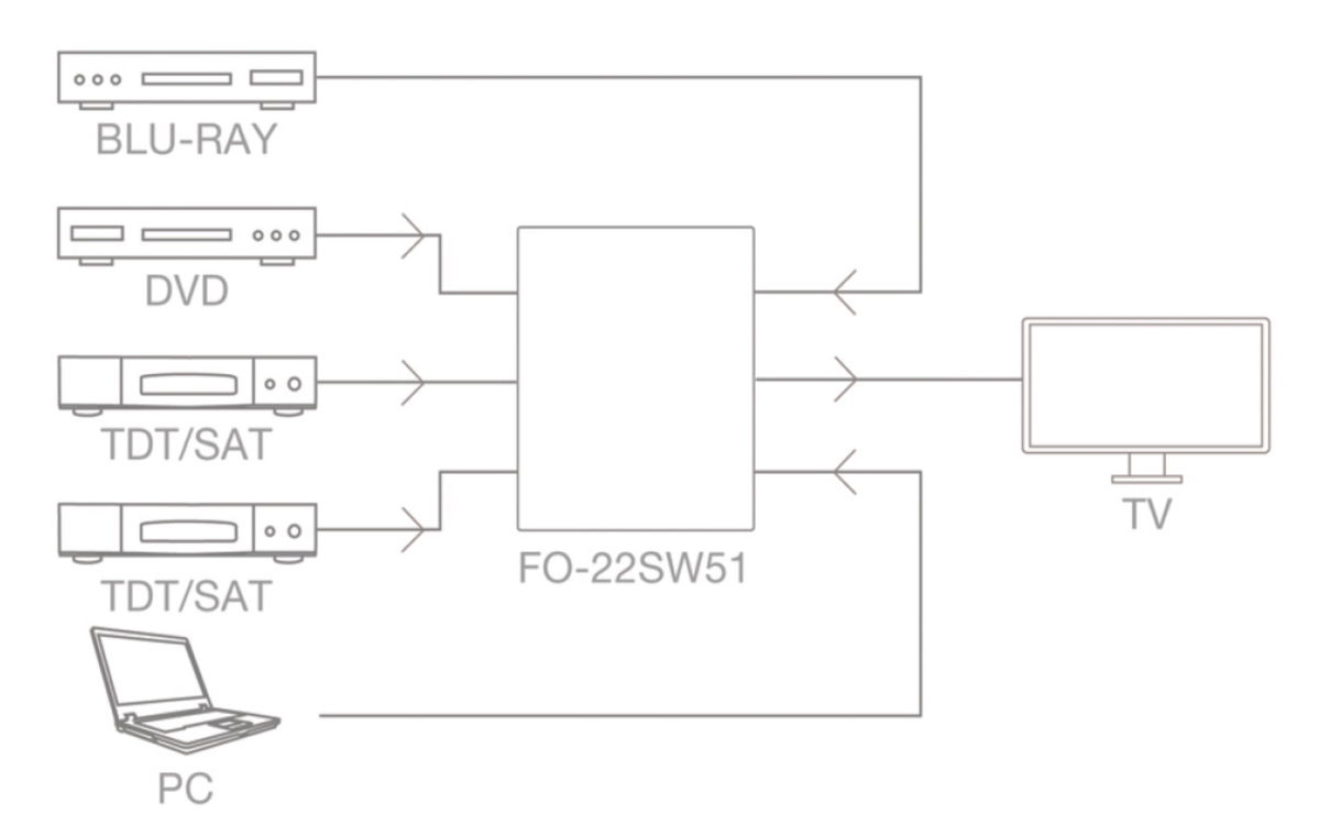Ideální pro připojení více zařízení například k TV nebo monitoru, který má menší počet HDMI vstupů. Umožňuje připojit 5 zařízení HDMI současně do jednoho vstupu a pomocí tlačítka na přístroji, nebo pomocí dálkového ovladače vybrat, které se má zobrazit. Vyznačuje se inteligentním automatickým přepínáním, které se aktivuje, jakmile je detekováno nové zařízení. Jedná se o malé zařízení Plug&Play, tudíž není nutná předchozí konfigurace.