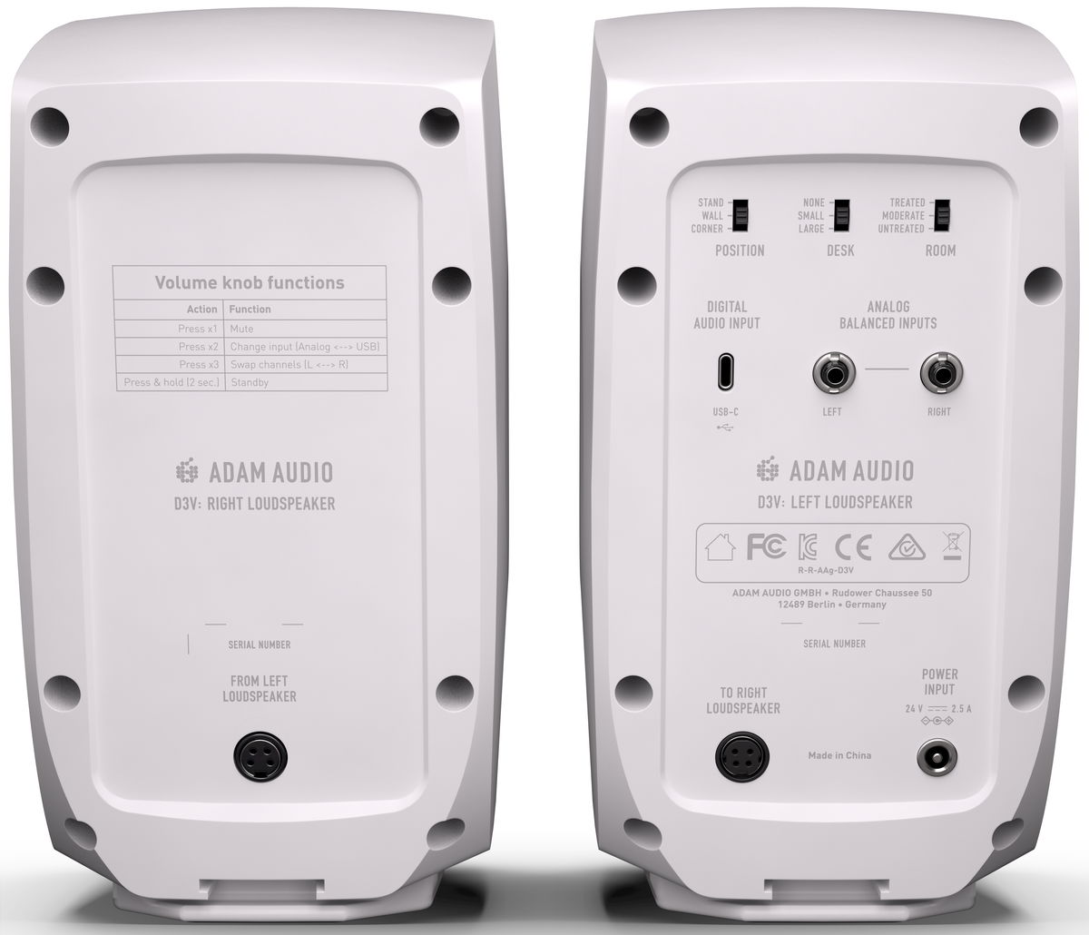 Zboží bylo vybaleno z obalu, jinak je zcela nové, nepoužité. Adam D3V jsou kompaktní aktivní poslechové monitory určené pro skladatele, producenty a milovníky hudby, jejichž hlavní předností je subtilní konstrukce a zabudovaný DAC převodník s USB připojením. Díky možnosti velmi blízkého poslechu a interní korekci akustiky místnosti jsou D3V ideálním řešením také pro zvukové inženýry na cestách a mobilní studia. Každý aktivní pár je vybaven 3,5“ hliníkovými woofery, které jsou doplněny oboustrannými pasivními zářiči pro rozšířenou odezvu ve spodním spektru, takto malý monitor pak dosahuje pokrytí basových frekvencí až do 45 Hz. Charakteristický výškový reproduktor AMT je začleněn v podobě 1,5“ D-ART modelu, který zajišťuje stejně přesný a nezkreslující vysoký tón, jímž jsou tyto zavedené monitory známé. Bi-amp zesilovač disponuje výkonem 80 W pro woofery, respektive 40W pro D-ART měniče. Nastavení monitoringu lze korigovat přepínači akustiky místnosti s podporou DSP, reproduktory jsou dodávány se stolními stojany a rozhraním pro montáž na mikrofonní stativ (3/8"). Výraznou předností modelu D3V je rozhraní USB-C, které umožňuje, aby se systém choval jako výstupní zvukové zařízení, a eliminuje tak potřeby dalšího externího zvukového rozhraní pro přehrávání. Nechybí ani analogové vyvážené vstupy TRS pro tradiční zvukové aplikace, či přední konektor pro sluchátka a multifunkční ovladač hlasitosti. Obsah balení 1x pravý reproduktor D3V 1x levý reproduktor D3V 2x výklopný stojan 6x stolní podložka 1x kabel pro propojení reproduktorů (2 m) 1x napájecí zdroj a síťový kabel D3V 1x kabel USB-C na USB-C (1 m) 1x adaptér USB-C na USB-A Stručný návod k použití a bezpečnostní pokyny Rozšířená záruka a DAW pluginy ke stažení zdarma Po registraci zakoupeného produktu na stránkách výrobce zároveň získáte prodlouženou záruku v celkové délce až 5 let. V uživatelské zóně MyADAM naleznete po přihlášení licenční kódy pro softwarové pluginy a nástroje, které jsou pro vás připraveny ve spolupráci s partnery Adam Audio, nabídka se neustále rozšiřuje. Pro všechny registrované uživatele Adam Audio je k dispozici zdarma např. plná verze DAW pluginu Denise Audio Bad Tape 2.