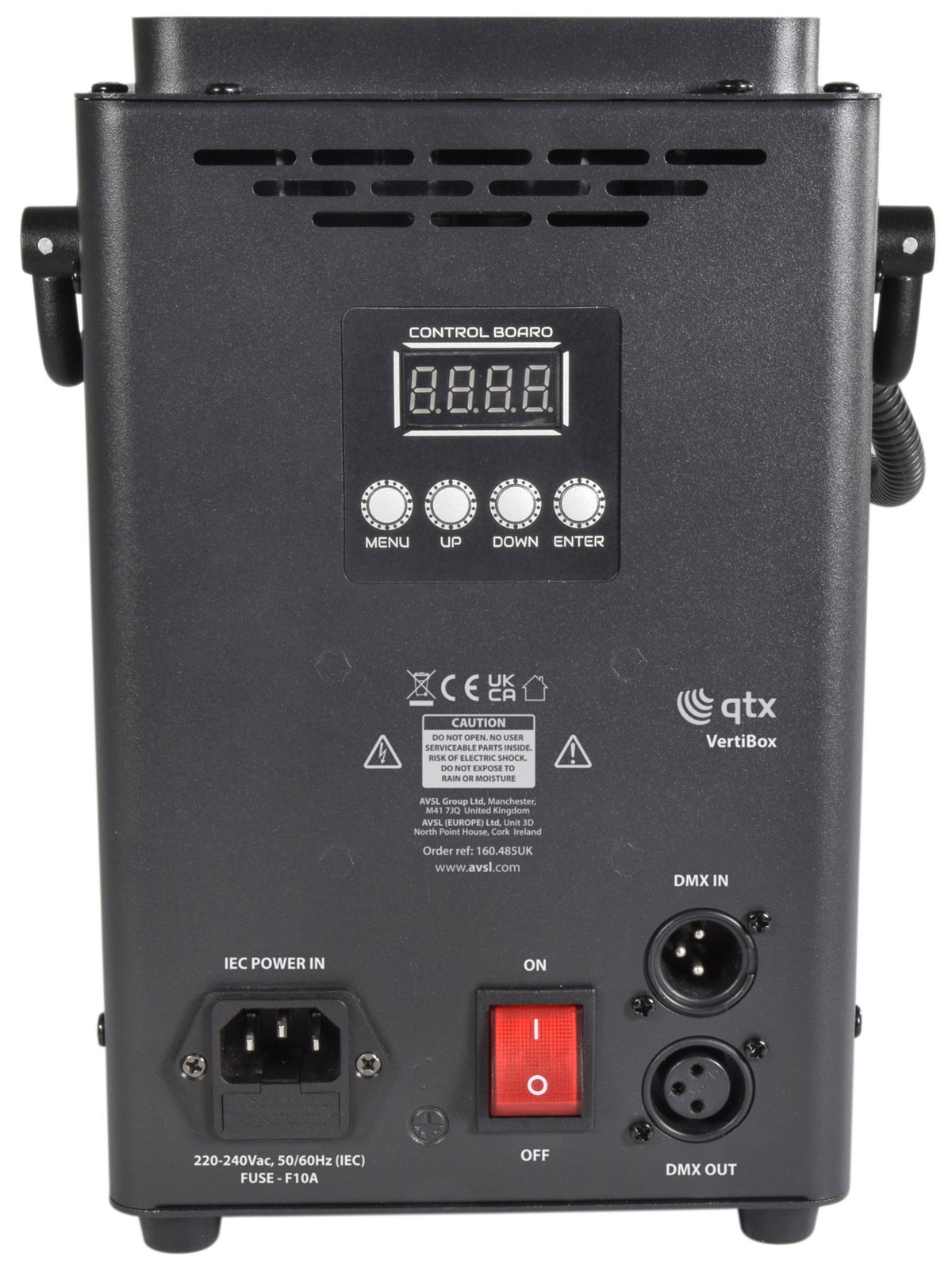 Malý a výkonný QTX VertiBox vytváří působivý proud vertikální umělé mlhy. Díky zabudovaným RGBA LED diodám lze zvýraznit výfuk kouře světelným efektem. Ovládání jednotky pomocí zabudovaného panelu s LED displejem přímo na přístroji, pomocí dodávaného bezdrátového ovládání v podobě klíčenky nebo pomocí DMX signálu (8 kanálů). Odnímatelná 1,2 litrová nádoba na kapalinu, rukojeť pro snadnou manipulaci. Vysoký výkon poskytuje za minutu zamlžení více jak 500 m³.