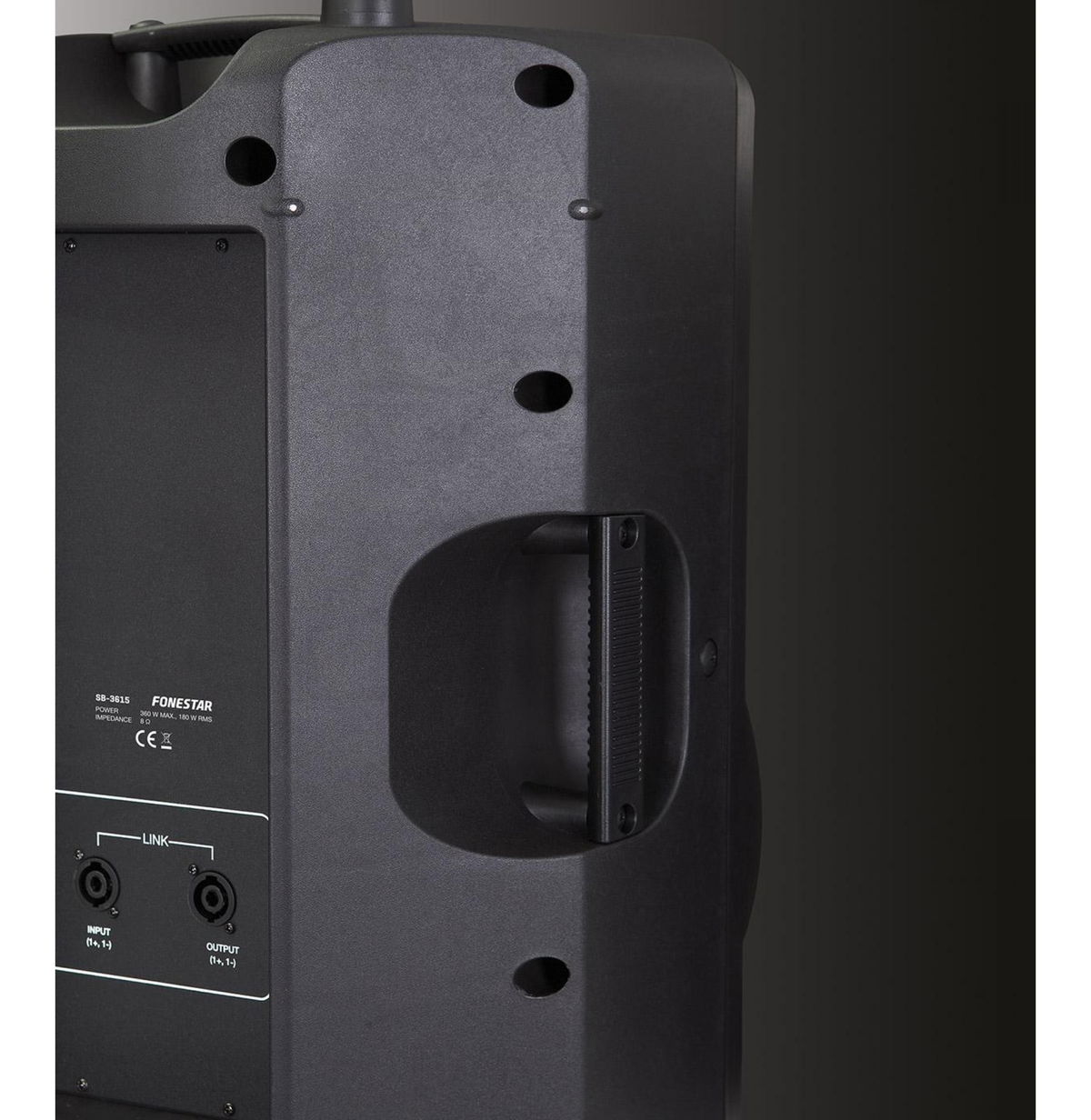 15" basový reproduktor chrání robustní kovová přední mřížka. Pro snadnou manipulaci jsou na bočních stranách skříně praktické úchyty pro přenášení.
