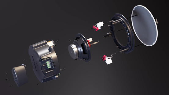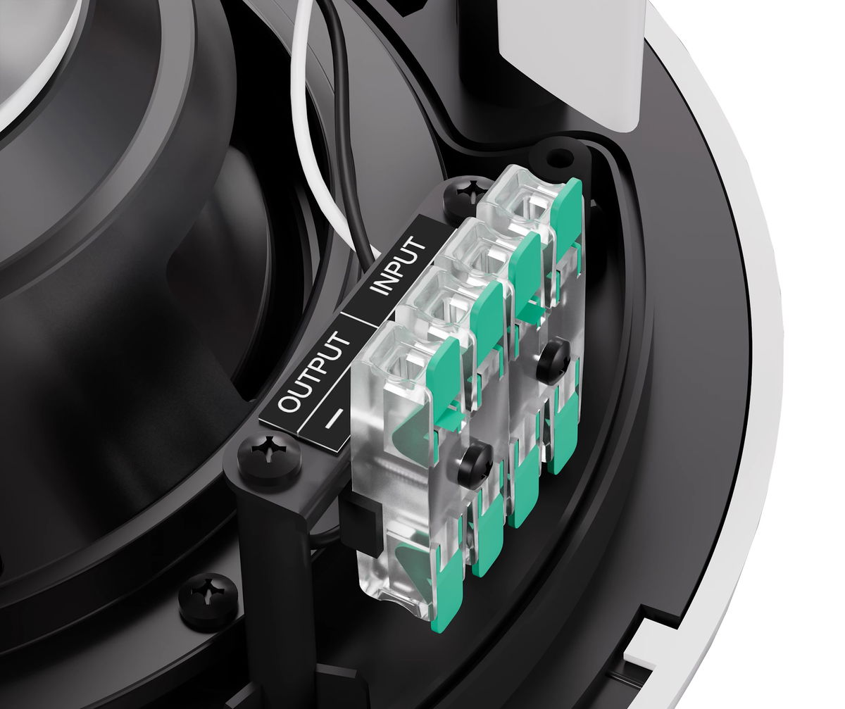 Část vyrobená z ABS je odolná proti UV záření a spolu s ocelovou mřížkou zajišťuje vysokou míru odolnosti. Nízkoprofilová mřížka bez viditelného rámečku je vyrobená z nerezavějícího hliníku a má odnímatelné, otočné logo, které lze odstranit a mřížku podle potřeby přelakovat na jinou barvu. Vlastní instalace je rychlá a jednoduchá díky systému uchycení se západkami, které zkracují čas montáže a minimalizují riziko pádu reproduktoru během instalace - háček pro bezpečnostní lanko. Šrouby zůstávají zcela skryty za mřížkou. Vodiče se připojují k reproduktorovým svorkám s kontakty s vysokou vodivostí.