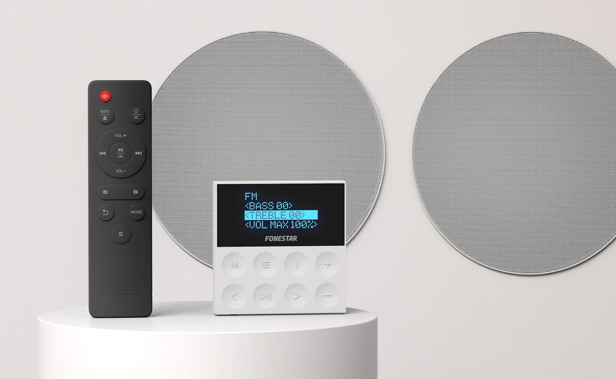 Miniaturní stereofonní nástěnný zesilovač (83 mm x 83 mm) umožňuje poslech vestavěného FM rádia s až 50 předvolbami a bezdrátové přehrávání hudby z telefonů nebo tabletů prostřednictvím Bluetooth. Nabízí i rozšířené možnosti pro připojení USB paměťového média nebo až dvou dalších zdrojů hudby. Zesilovač má paměť posledního zvoleného režimu a interní přehrávač po zapnutí jednotky automaticky zahájí přehrávání. Nastavit lze i časovač pro automatické vypnutí zařízení. Využít můžete i více zesilovačů v systému pod různými jmény - pro instalaci v rámci systému multiroom s několika jednotkami je implementována možnost změny Bluetooth ID jména a hesla pomocí PC softwaru.