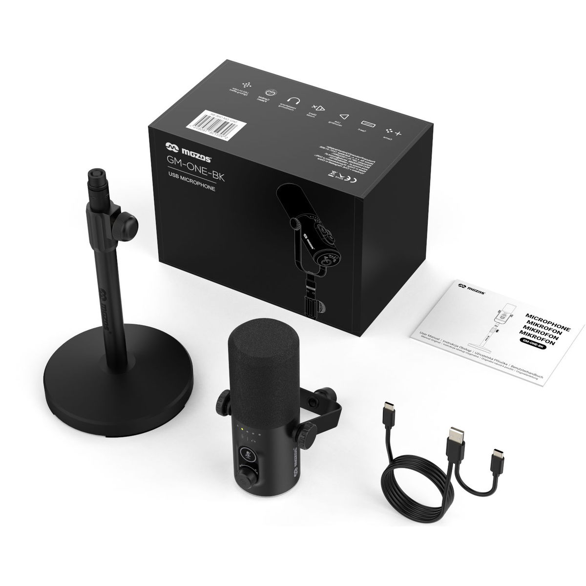Mozos GM-ONE-BK je dynamický studiový mikrofon, který zaujme svou jednoduchostí, všestranností a především profesionální kvalitou zvuku. Díky kardioidní směrové charakteristice spolehlivě potlačuje okolní ruchy a soustředí se na zachycení zvukového zdroje se všemi jeho nuancemi. Frekvenční rozsah 50 Hz–12 kHz a vysoké rozlišení 192 kHz / 24 bitů dodávají nahrávkám přirozenou barvu a detail, což z mikrofonu dělá ideální volbu pro celou řadu využití, ať už jde o podcasty, streamy, videokonference nebo studiové nahrávání vokálů či nástrojů. Jednou z největších předností tohoto modelu je jeho duální konektivita USB-C a XLR, díky níž se snadno přizpůsobí domácímu i profesionálnímu prostředí. Digitální USB připojení umožňuje okamžitý provoz bez potřeby dalšího vybavení – stačí připojit k notebooku a můžete nahrávat, zatímco XLR výstup otevírá dveře k využití v profesionálních studiích s mixpulty, zvukovými kartami a dalšími audio rozhraními. Bytelná konstrukce, stabilní železná základna a nastavitelný stolní stojan o výšce v rozsahu 23–32,5 cm zajišťují pohodlné používání při nahrávání i streamování. Součástí balení je také 2m kabel.