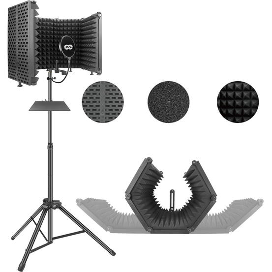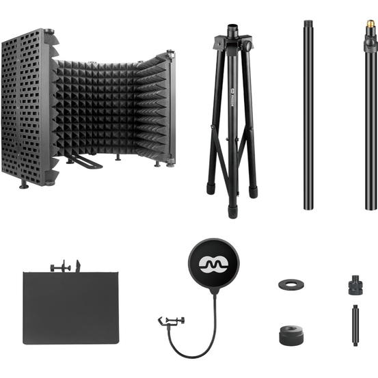 Zboží bylo vybaleno z obalu, jinak je zcela nové, nepoužité. Univerzální sada tvořená akustickým paravanem, výškově nastavitelným stojanem, pop filtrem a odkládací plochou pro mixpult, sluchátka, laptop, nebo USB zvukové rozhraní. Mikrofonní zástěna pro získání čistého signálu bez nežádoucích ruchů a hluků. Skvěle se hodí pro nahrávání zpěvů, podcastů do rádia nebo na Youtube, což zajisté ocení mladí a nadějní vlogeři. Vnitřní stěna je vyrobena z kvalitní akustické pěny pohlcující hluk, vnější stěnu potom pokrývá plastový EVA materiál pro bezpečný transport a uskladnění. Paravan tvoří pět libovolně nastavitelný částí, takže si ho bez problému přizpůsobíte vašim požadavkům a preferencím. Součástí balení je také sada upevňovacích závitů a distančních tyčí.