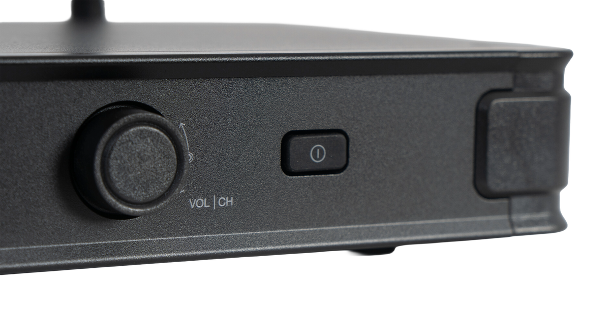 Přijímací jednotka nabízí přehledný displej s indikací RF signálu, úrovně audio signálu a stavu baterie mikrofonu. Pro snadné připojení do ozvučovacích systémů jsou k dispozici dva nezávislé symetrické XLR výstupy a jeden nesymetrický mixovaný výstup - jack 6,3 mm.