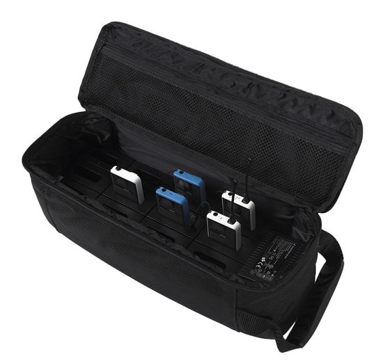 Kromě funkce nabíjení slouží TOURC-12 jako bezpečné pouzdro pro transport vaší techniky. Robustní konstrukce chrání citlivá zařízení před nárazy a poškozením. Kompletní nabití všech vložených jednotek trvá přibližně 7 hodin. Pro zajištění dlouhé životnosti antén u vysílačů doporučuje výrobce provádět nabíjení s otevřeným víkem kufru.