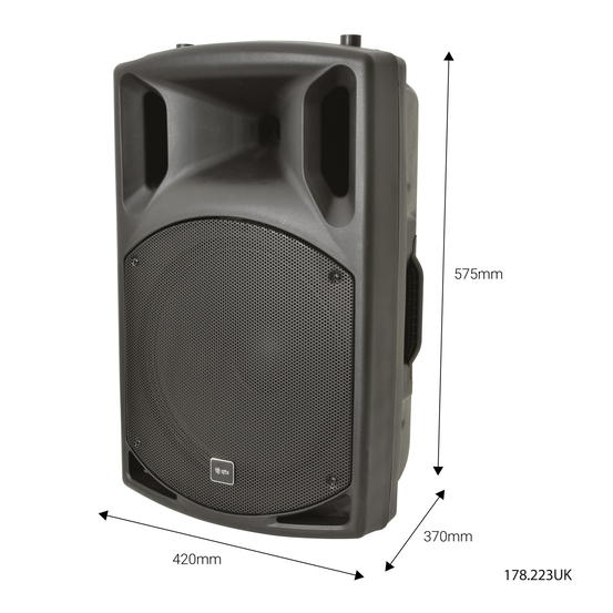 Pasivní dvoupásmový reprobox, výkon 250W RMS, impedance 8 ohmů, 15" středobasový reproduktor, titanový kompresní výškový driver, plastové tělo, ochranná mřížka středobasového reproduktoru, postranní madlo, zapuštěné hnízdo Ø 35 mm pro reproduktorový stojan nebo nástěnný držák.