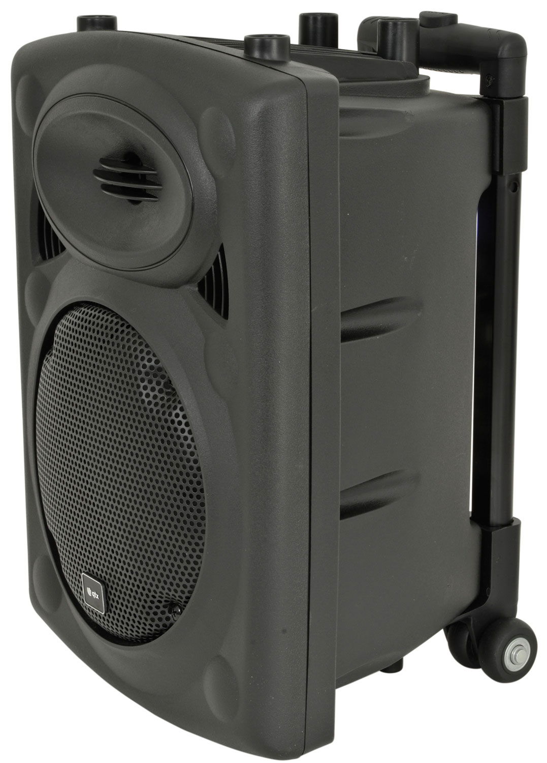 Kompaktní 8" přenosný PA zvukový systém. Vestavěný zesilovač napájený ze sítě nebo z interní dobíjecí baterie napájející hlavní měnič a kompresorem řízenou hornovou jednotku. Součástí balení je ruční bezdrátový UHF mikrofon s přijímačem zabudovaným v sekci mixážního pultu/zesilovače v zadní části spolu s dalšími dvěma kabelovými mikrofonními vstupy, pomocným linkovým vstupem a integrovaným USB/SD/FM přehrávačem médií s funkcí nahrávání. V přehrávači médií je také zabudován Bluetooth přijímač, který umožňuje spárování s chytrým telefonem nebo tabletem pro bezdrátové přehrávání zvuku s párováním TWS pro propojení 2 QRPA jednotek jako stereo páru BT. Zatahovací rukojeť a zadní kolečka.