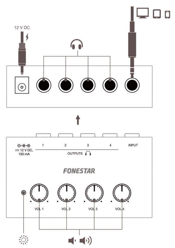 Pokud potředbujete rozbočit audio signál do více sluchátek (až čtyř) a nezávisle ovládat hlasitost pro každý výstup, je pro vás Fonestar FDA-4A tím nejlepším řešením.